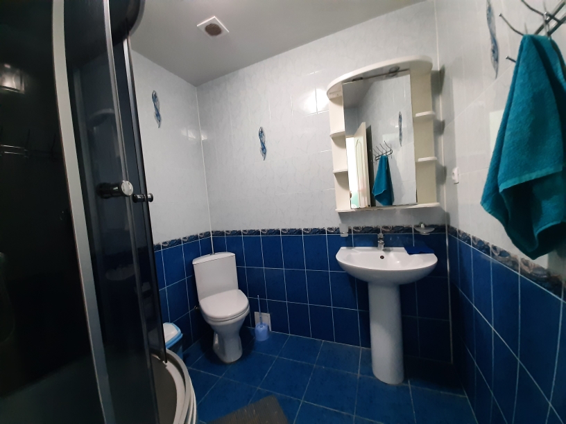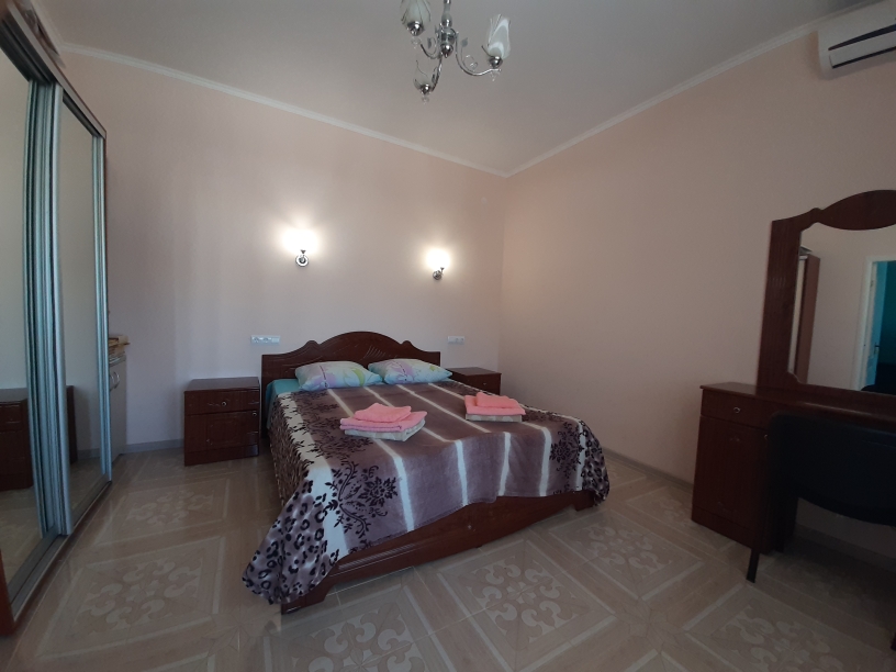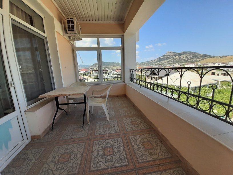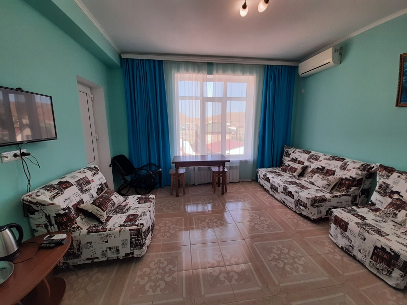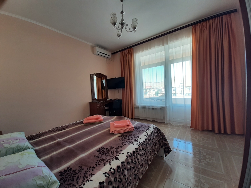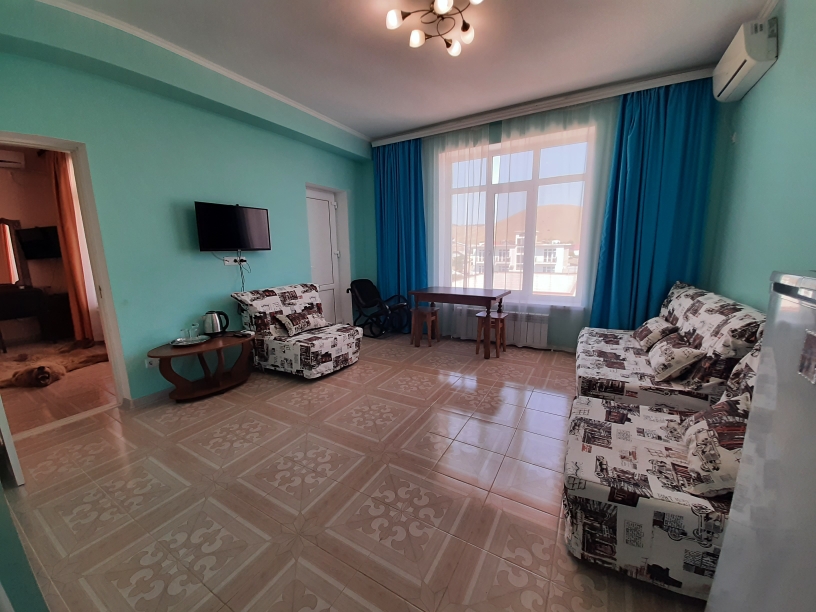 Панорамный номер на 4-м этаже, в номере одна двуспальная кровать, диван, кресла- кровати, санузел, ТВ, холодильник, кондиционер в каждой комнате, шкаф, журнальный столик, туалетный столик, балкон, столик и стулья на балконе или террасе, электрочайник, фен.