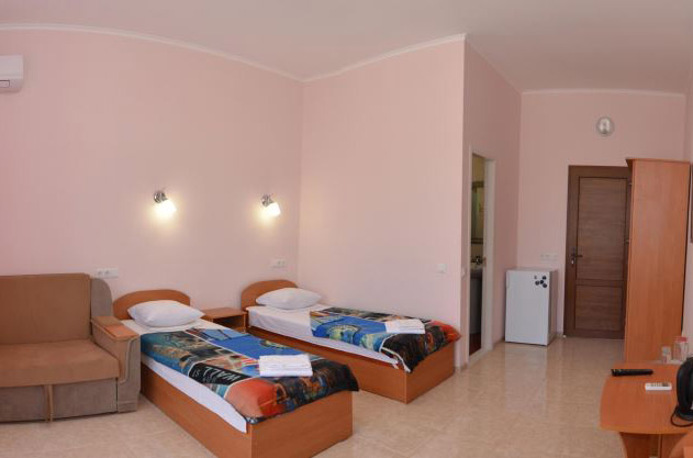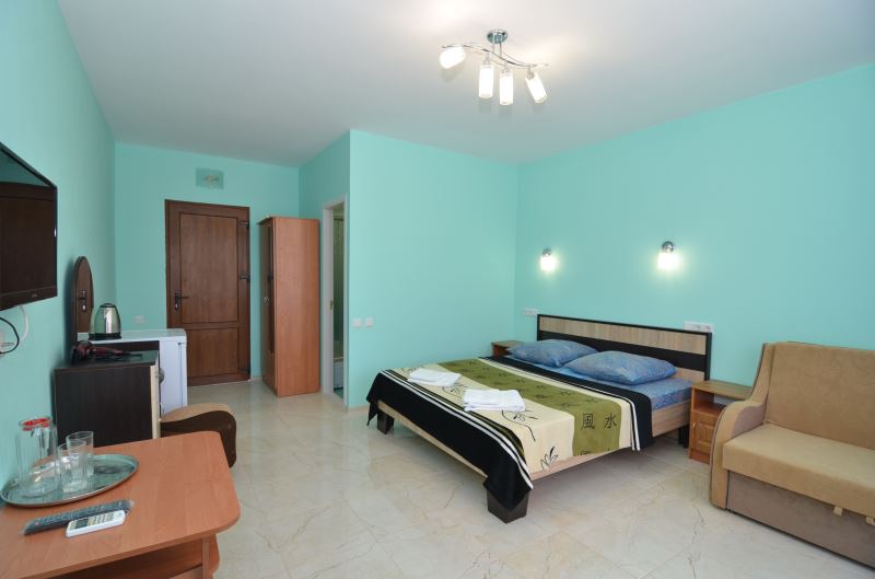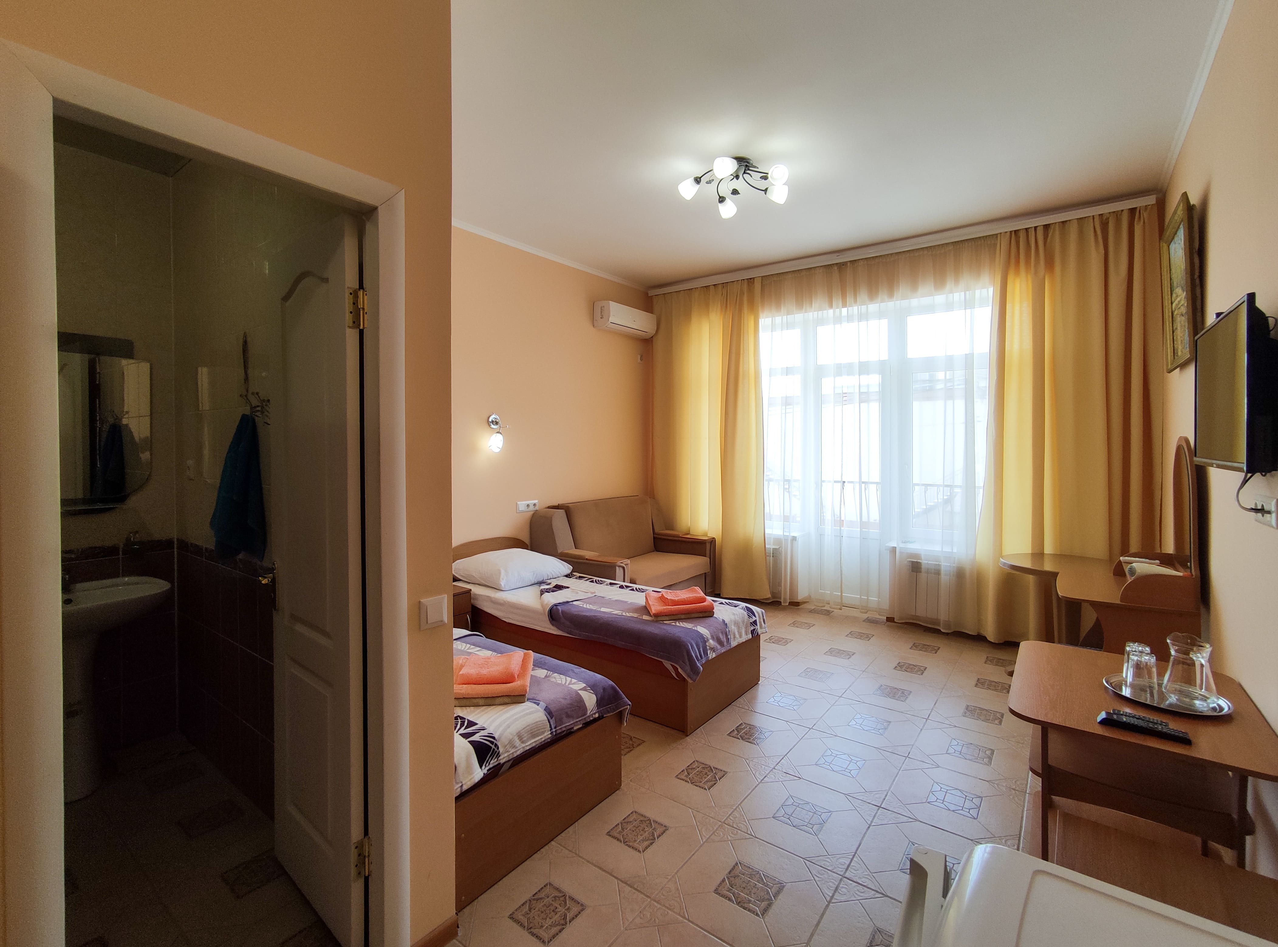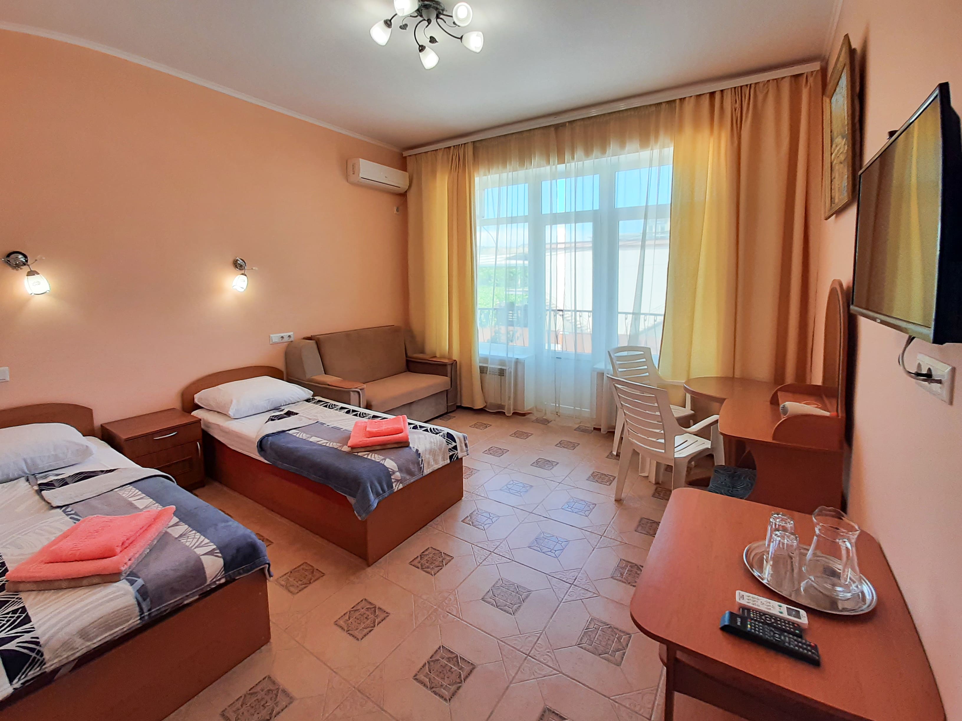 В номере две односпальные или одна двуспальная кровати, диван, санузел, ТВ, холодильник, кондиционер, шкаф, журнальный столик, туалетный столик, балкон, столик и стулья на балконе, электрочайник, фен.