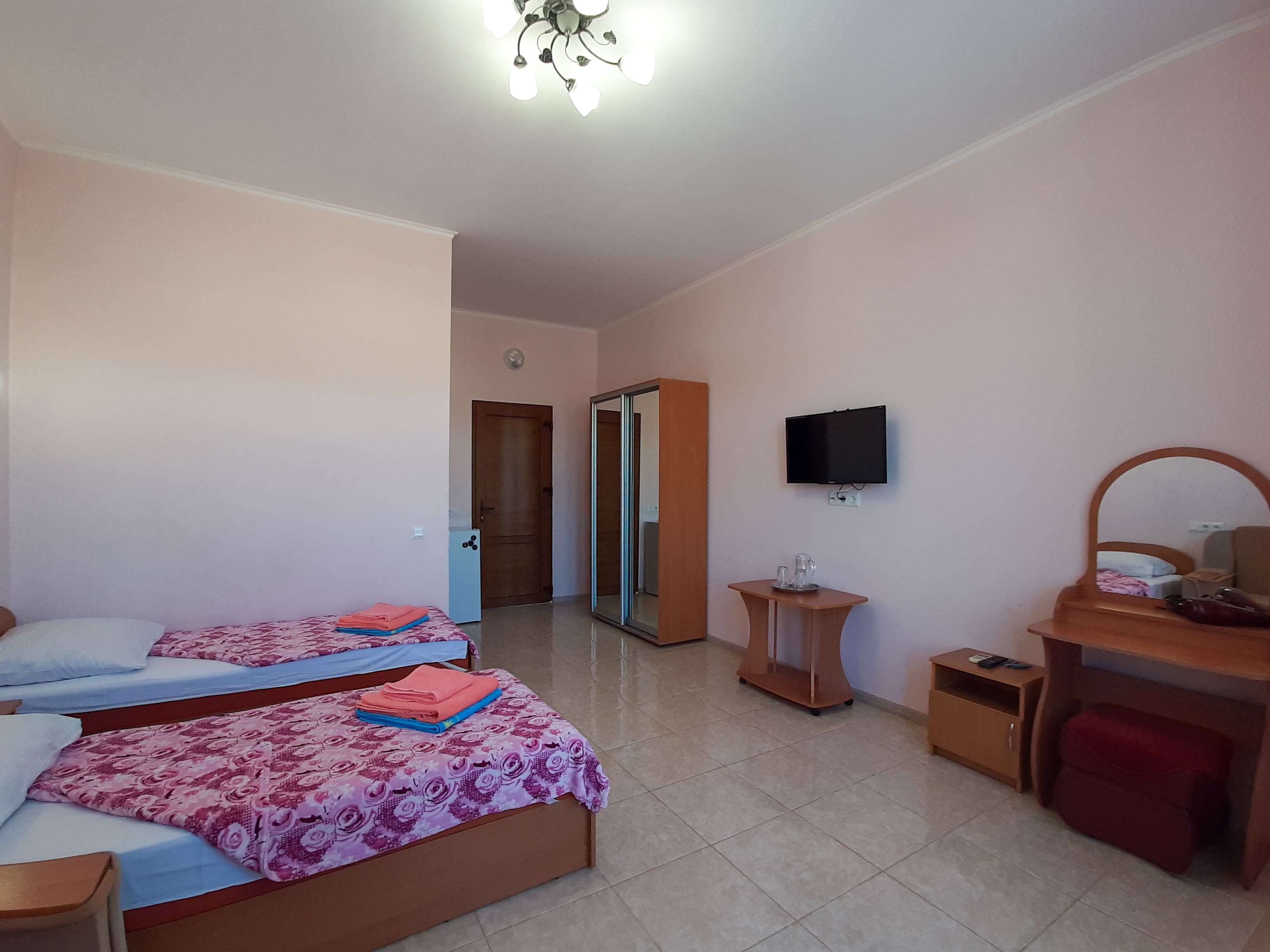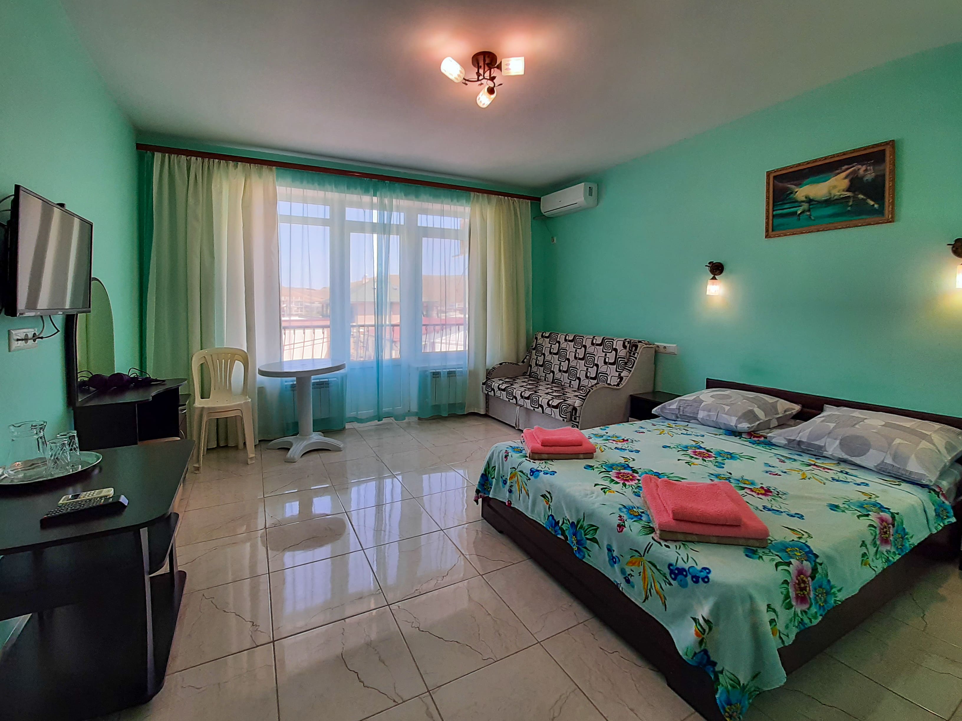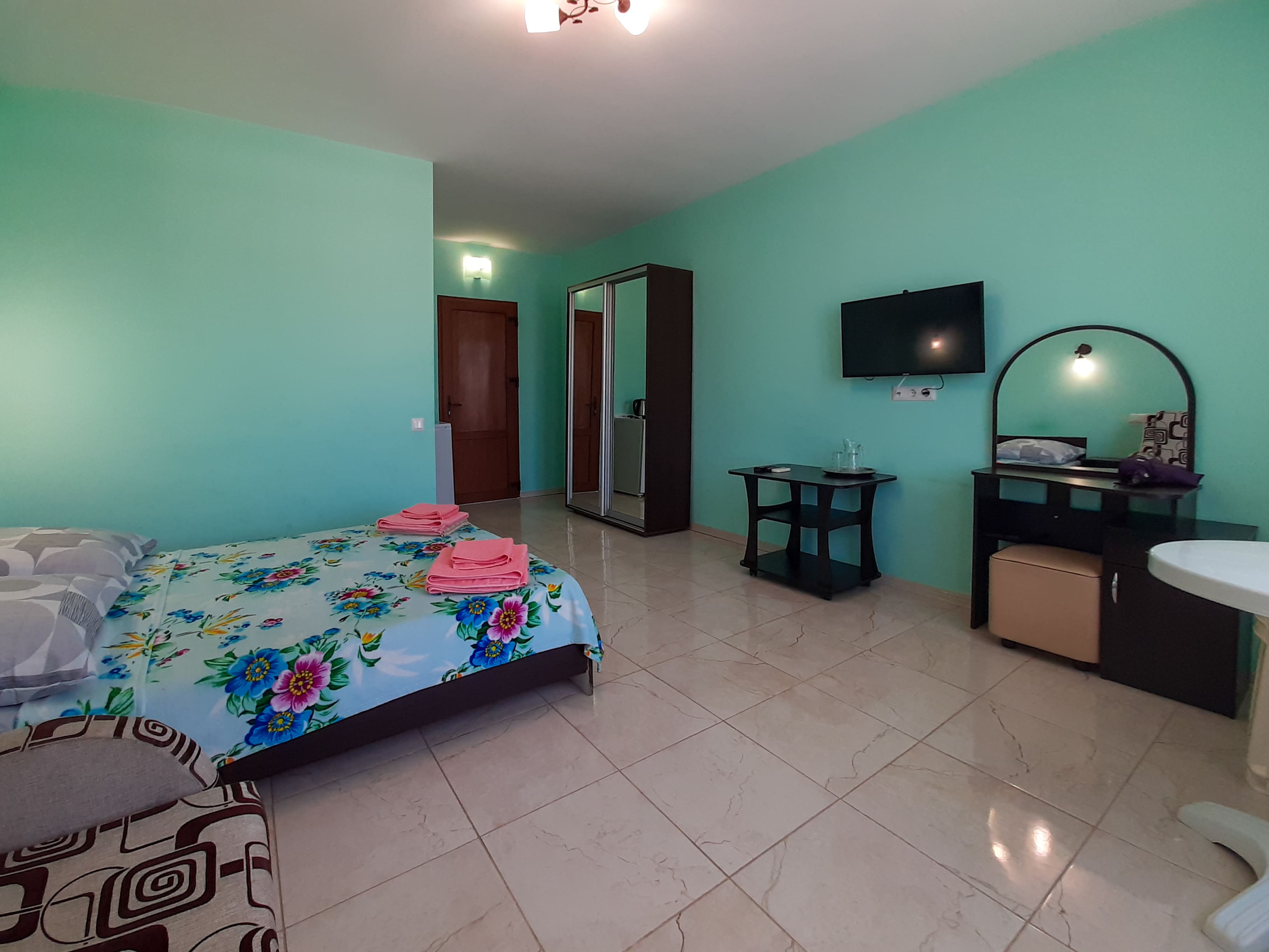 В номере две односпальные или одна двуспальная кровати, диван, санузел, ТВ, холодильник, кондиционер, шкаф, журнальный столик, туалетный столик, балкон, столик и стулья на балконе, электрочайник, фен.